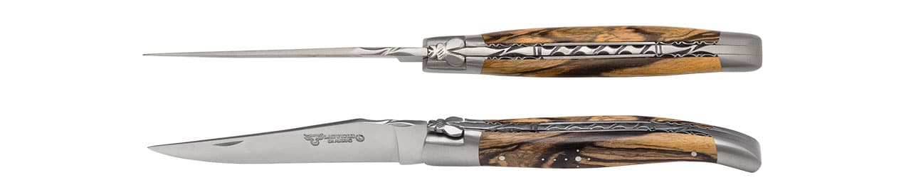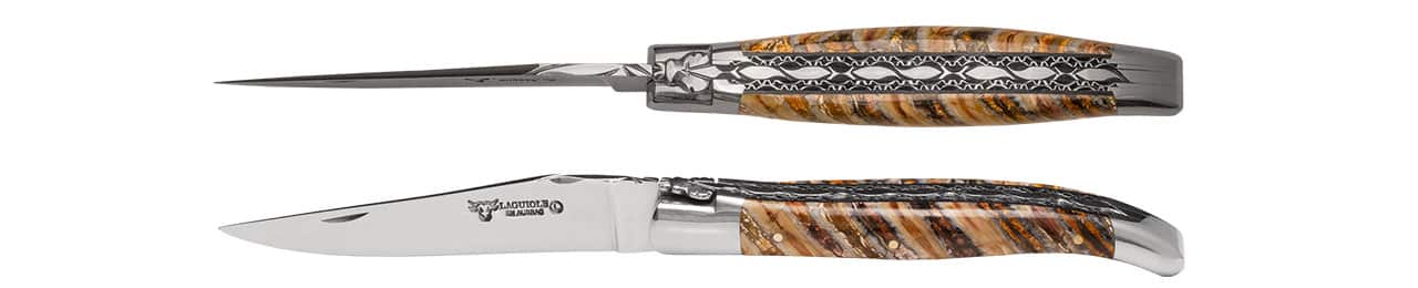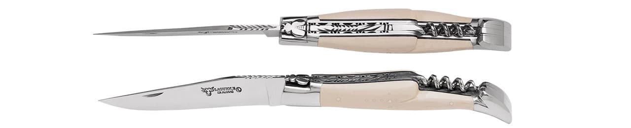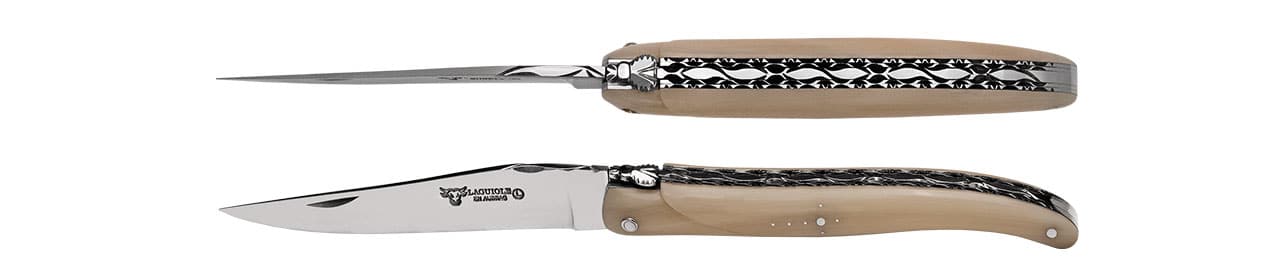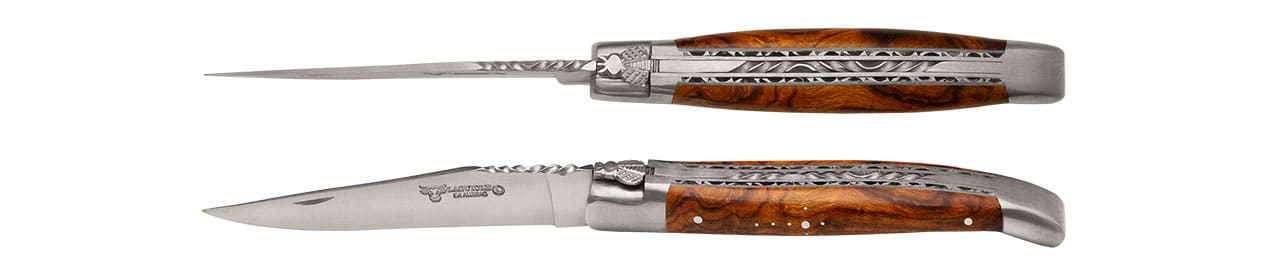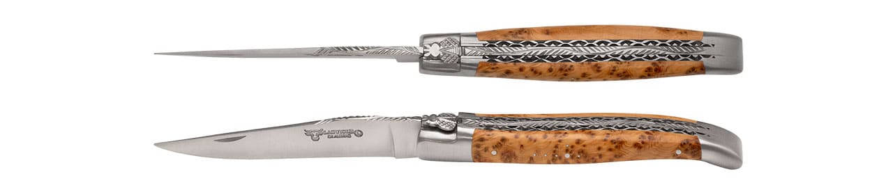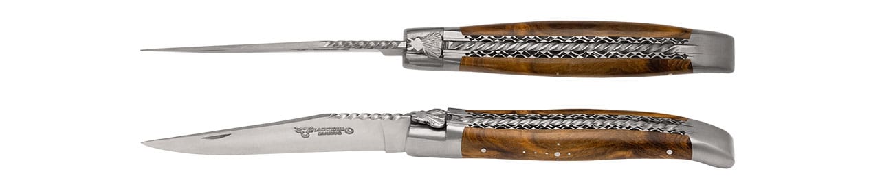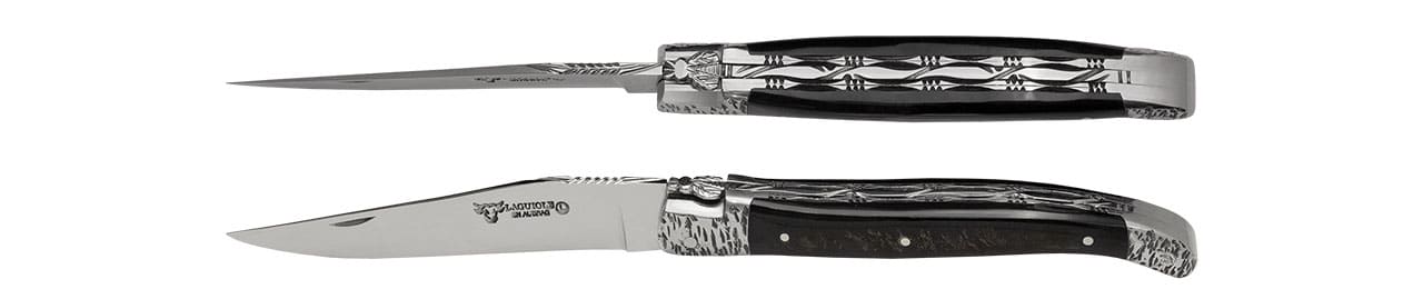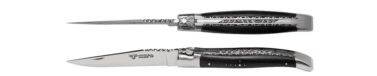 A beautiful variation of the double-plated Laguiole is the knife with handcarved plates. Here, the knife features a single pair of finely hand-decorated plates for a sophisticated result and an artistic touch.